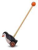 Lead the march of the penguins with this charming wooden bird. It`s fun to listen to its wings flap while its wheels spin around, forward or backward. With a large wooden knob for easy grasping, this is a wonderful first push toy to accompany those first steps! Brightly painted with non-toxic paint.