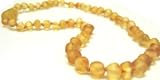 WHAT IS AMBER TEETHING NECKLACE? A Baltic amber teething necklace is made for wearing (not chewing) when a baby is teething. The warmth from the skin releases the active ingredient in the Baltic amber, succinic acid. Recent scientific research has proved that succinic acid has a very positive influence on the human body. It improves immunity and the balance of acids when absorbed into the bloodstream; it stimulates the thyroid glands to help reduce drooling and soothes red inflamed cheeks. Amber's anti-inflammatory and therapeutic properties are recognized by allopathic medicine as a natural analgesic, which will help to relieve teething pain and calm a baby without resorting to drugs. The skin's warmth releases healing oils from the amber, a resin, which is absorbed into the bloodstream. The necklaces are approx. 13 inches in length and strung on silk. The beads are individually knotted for safety. This necklace looks great when paired with a teething bracelet. Parent supervision is recommended.