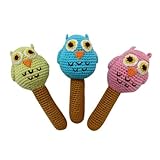 Organic handmade baby's rattles include 2 birds and 1 owl. A forest of little critters for your little ones to enjoy.